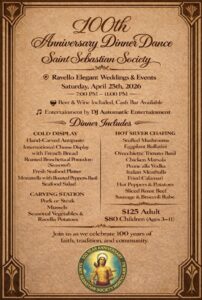 Ravello offers the perfect setting for a truly unforgettable night of fine dining, cherished company, and joyful festivity. As we commemorate a century of devotion and tradition, the evening’s soundtrack will be masterfully curated by Automatic Entertainment DJ's, ensuring the dance floor remains vibrant and the atmosphere electric.We invite you to join us, raise a glass, and step gracefully onto the dance floor as we celebrate 100 remarkable years in grand style.Contact Dinner Dance Chairman Pat Palmieri at E-Mail:palmieri75@gmail.com